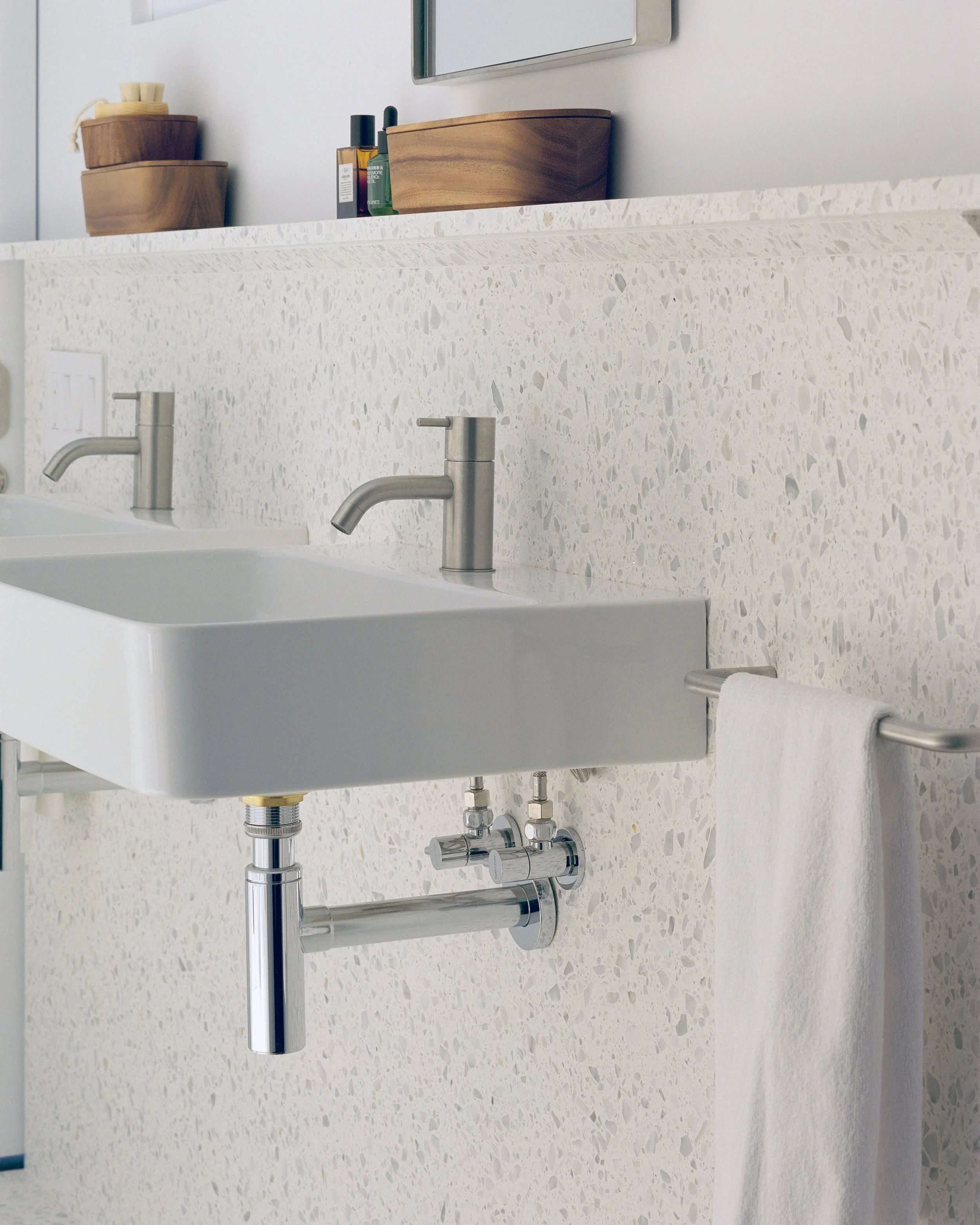 VOLA HV1 是面盆檯面式安裝最簡約經典的一款。我們選擇不鏽鋼毛絲處理的面材,整體由內而外一致性的表現,在觸摸時覺得很扎實;毛絲面產生模糊隱晦的光澤,帶來溫柔感。前端出水口彎曲一個角度,讓水流前傾、更接近面盆中央,洗手時不會覺得空間局促(實在是看過太多龍頭位置設計不良,導致洗手時手都要撞到面盆邊緣了)。